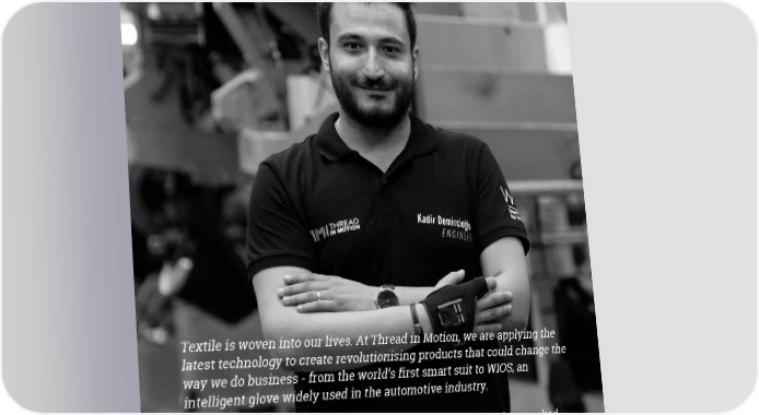 Logo Textile is woven into our lives. At Thread in Motion, we are applying the latest technology to create revolutionising products that could change the way we do business - from the world’s first smart suit to WIOS, an intelligent glove widely used in the automotive industry. Mercedes-Benz is an early adopter of new technologies and we worked closely together to develop optimal solutions to fit their needs. Our collaboration with Mercedes-Benz opened a lot of doors and soon we started working with Renault, Hyundai and Fiat, and automotive suppliers such as Bridgestone - Lassa. Now we are tapping into retail, logistics, aviation and e-commerce industries. Kadir Demircioglu, CEO and Founder of Thread in Motion