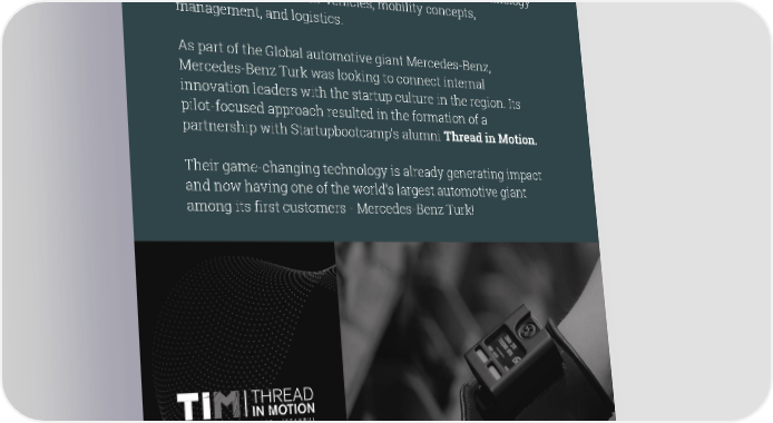 Introduction As a pioneer of the automobile industry, Mercedes-Benz is committed to innovation and technological advancement. Their team is at the forefront of new age innovation technology in areas that affect their vehicles, mobility concepts, management, and logistics. As part of the Global automotive giant Mercedes-Benz, Mercedes-Benz Turk was looking to connect internal innovation leaders with the startup culture in the region. Its pilot-focused approach resulted in the formation of a partnership with Startupbootcamp’s alumni Thread in Motion. Their game-changing technology is already generating impact and now having one of the world’s largest automotive giant among its first customers - Mercedes-Benz Turk!