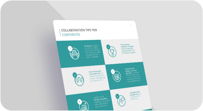 15 COLLABORATION TIPS FOR CORPORATES 1 Get buy-in throughout 2 Have a startup your whole company. innovation champion You can’t just mandate and encourage them from the top, you need to get immersed in the the people who will local startup ecosystem. have to implement. Don’t isolate your Create the right 3 innovation team. It’s 4 infrastructure and an inter-departmental processes - sandboxes, activity - from legal, risk, APIs, test data for new procurement and IT. solutions, and fast-track procurement processes with streamlined SLAs. Identify the right Understand how 5 KPIs for innovation. 6 startups think and Traditional metrics won’t be aware of their often reflect the true reservations. value of innovation. 7 Ensure the startup is 8 Collaborate, don’t complimentary to your dominate. Recognise business. Don’t just work that the startups are with a startup because bringing value and their product is ‘cool’. are generally wary of corporates. 9 Startups change fast, 10 Move fast. Understand but recognize that you startups can be born won’t, at least not yet. and die within the space One partnership with of time it takes for you to a startup won’t change negotiate a contract! your company. It has to be part of a long-term strategy and solutions.
