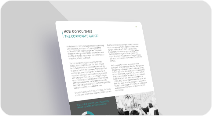 07 HOW DO YOU TAME THE CORPORATE GIANT? While there are clearly many advantages to partnering find the complicated and lengthy internal processes with corporates, startups aren’t approaching this within corporates to be the biggest challenge when collaboration with rose-tinted glasses. They know trying to collaborate with them. It can be hugely there are challenges that need to be overcome and frustrating for the fast-moving entrepreneur when the 72% of startups we surveyed had concerns prior timelines start moving at the slower pace of the to working with big businesses. corporate partner. This will be a challenge we’ll tackle later when our corporate interviewees offer advice for The first hurdle is simply knowing how to make startups. contact with corporates in the first place. Around two in five (39%) of startups are unsure about who Another cause for concern is protection of the to approach within the businesses they’ve identified, startup’s IP. Small businesses often fear the resources and this isn’t a surprise. Even if a business has an of larger organisations and worry that it could be easy innovation practice, there could be multiple people for their idea to be taken, replicated and implemented with varying remits to talk to, and they are likely to without them seeing any benefit. It’s rarely a problem be inundated with unsolicited approaches. Working in reality, as corporates are likely to be too committed with organisations that can facilitate this process to delivering their own road map to change tactic, becomes highly valuable, which is when programs like but 8% of our survey respondents are still concerned Startupbootcamp’s come into their own. their idea would be stolen. It suggests a need to build trust at the early stages of the corporate collaboration Once startups have their foot in the door, the issues and underlines the importance of cementing solid are not over. Nearly three quarters (70%) of startups relationships. WHAT IS THE BIGGEST CHALLENGE WHEN TRYING TO WORK WITH CORPORATES? 70% of startups 70% experience a complicated or long internal process working with corporates 9% of startups feel there is 9% no single point of contact 4% of startups believe 4% there is a lack of priority and uncertainty