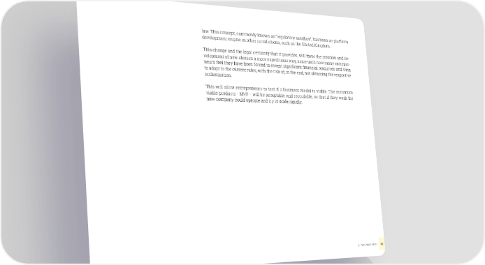 law. This concept, commonly known as “regulatory sandbox”, has been an platform development engine in other jurisdictions, such as the United Kingdom. This change and the legal certainty that it provides, will favor the creation and de- velopment of new ideas in a more expeditious way, since until now many entrepre- neurs feel they have been forced to invest significant financial resources and time to adapt to the current rules, with the risk of, in the end, not obtaining the respective authorization. This will allow entrepreneurs to test if a business model is viable. The minimum viable products - MVP - will be acceptable and recordable, so that if they work the new company could operate and try to scale rapidly. A TWO-WAY PATH 28