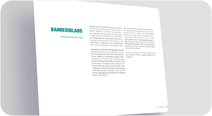 BanregioLABS is a hybrid between an innovation The outcomes of this initiative are extraordinary. lab, acceleration program and Corporate Venture BanregioLABS has launched several innovative BANREGIOLABS Capital. However, it is difficult to categorize it products into the market: HEY, a phone app by a rigid definition because of the diversity of working as a bank without branches; COCHI, a its approach and methods, since it experiments savings system that allows the client to create www.banregiolabs.com and researches new technologies and how to saving goals; COLECTO, a management system for implement them to better serve clients. At the SMEs that enable them to control their inventory same time, it cooperates with entrepreneurs and payment channels; and a proper payment and FinTech companies for its business ideas. engine for Banregio to enhance card processes and payment methods. BanregioLABS searches for entrepreneurs through partnering with accelerators and funds to identify Currently, BanregioLABS is experimenting with those entrepreneurs with whom there may be a Aura Banregio, the first chatbot operating on mutual interest to collaborate and support them Facebook. to launch pilots. The next step is to help and give advice to develop the product according to the bank’s needs. To strengthen itself, BanregioLABS formed alliances with several Silicon Valley companies, which contributed more training and banking design knowledge. At the end of the process, BanregioLABS decides if it is willing to invest in the startup A TWO-WAY PATH 83
