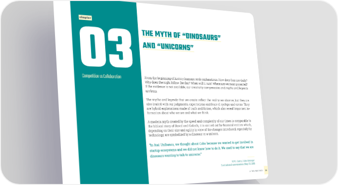 chapter THE MYTH OF “DINOSAURS” 03AND “UNICORNS” Competition vs Collaboration From the beginning of history humans seek explanations. How does Sun rise daily? Why does the night follow the day? When will it rain? Where are we most protected? If the evidence is not available, our creativity compensates and myths and legends are born. The myths and legends that we create reflect the reality we observe, but they are also loaded with our judgments, expectations and fears of cyclops and sirens. They are hybrid explanations made of truth and fiction, which also reveal important in- formation about who we are and what we think. A modern myth created by the speed and complexity of our times is comparable to the biblical story of David and Goliath; it is carried out by financial entities which, depending on their size and agility in view of the changes introduced, especially by technology, are symbolized by a dinosaur or a unicorn. “In Itaú Unibanco, we thought about Cubo because we wanted to get involved in startup ecosystems and we did not know how to do it. We used to say that we are dinosaurs wanting to talk to unicorns.” R.P.S. Gama, Cubo Manager Institutional conversation, May 28, 2018 A TWO-WAY PATH 34