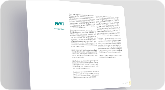 There is an app revolutionizing the finances, Payit service is free for users. Revising your bal- disappearing cash and offering in exchange a ance and making transactions with your debit digital, agile and simple solution for any person card or top up a mobile has no cost. The model may access his money. Its name is Payit and it is to gain money and capitalize the business is freely available for iOS and Android. Everything through fees on payments, with credit card (3%), commenced in August 2016, thanks to a seed American Express (5.5%), transferring a balance PAYIT capital investment of 350,000 dollars granted to a bank account (7.50 pesos) and payment of by Grupo MAPS and Investo. affiliated services (9.00 pesos). Likewise, users www.payit.mx of this app may use this app without being af- Currently, to access Payit, you only have to filiated to any financial institution and receive download the app, create a user and link it to cash through an electronic payment card, which a bank credit or debit account. Thereupon, you may not be linked to the commercial banking. can make money transfers to any contact in your mobile address book. The platform does In this way, a person who was not bankarized, not work as a financial service company, but it currently already accepts digital payments and safeguards the money users have in their Payit may access his money through a debit card pro- account, an intermediary bank account. When cessed within five minutes. Nowadays, Payit has users need to use cash, Payit transfers that money more than 105,000 users and more than 117,000 to their linked account. transactions conducted, equivalent to 26 million pesos transacted since August 2016. The company Martin MexĂa, Payit CEO, imagined, created and is growing 25% per month and earns in average created with his team this digital payment mobile 2.5 million pesos in transactions per month. platform that, in his opinion, serves the needs that not even the mobile banking nor portable The goal is to reach one million users by the end terminals could solve. of 2018 and 7 million in five years. With Payit, you can transfer money to any person from mobile devices and smartphones. You can make payments from informal commerce, such as a carwash until repaying a friend any cash loan to pay jointly an account. Recipients of the transaction do not necessarily have to be users of this app, because the trans- actions may be made through a text message, email or sole interbanking code (CLABE). A TWO-WAY PATH 90