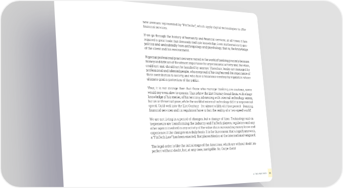 new avenues represented by “FinTechs”, which apply digital technologies to offer financial services. If we go through the history of humanity and financial services, at all times it has required a great trade that demands multiple knowledge, from mathematics to geo- politics and undoubtedly from anthropology and psychology, that is, the knowledge of the client and his environment. Rigorous professional practices were rooted in the world of banking precisely because money and debt are of the utmost importance for any economic activity and, therefore, could not and should not be handled by anyone. Therefore, banks are managed by professional and talented people, who are proud of having learned the importance of their contribution to society, and who face a tenacious scrutiny by regulators whose ultimate goal is protection of the public. Thus, it is not strange then that those who manage Banking are cautious, some would say even slow to operate. This is how the 21st Century found them, with a huge knowledge of his metier, of his territory, advancing with internal technology teams, but an arithmetical pace, while the world of external technology did it at exponential speed. Until well into the 21st Century - for almost a fifth of it has passed - Banking, financial services and its regulators have to fact the reality of a ‘two-speed world’. We are not living in a period of changes, but a change of time. Technology and en- trepreneurs are transforming the industry and FinTech players, regulators and any other agents involved in any activity of the value chain surrounding money know and experience it the changes on a daily basis. It is for this reason that a legal framework, a “FinTech Law” has been enacted, that places Mexico at the international vanguard. The legal order is like the initial maps of the Americas, which are without doubt im- perfect without doubt, but, at any case, navigable. So, Carpe diem! A TWO-WAY PATH 22