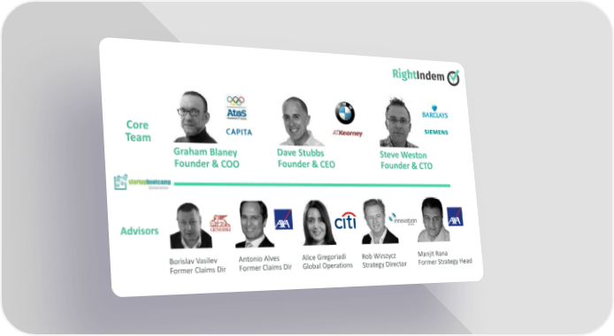 Core Team Graham Blaney Dave Stubbs Steve Weston Founder & COO Founder & CEO Founder & CTO Advisors Borislav Vasilev Antonio Alves Alice Gregoriadi Rob Wirszycz Manjit Rana Former Claims Dir Former Claims Dir Global Operations Strategy Director Former Strategy Head