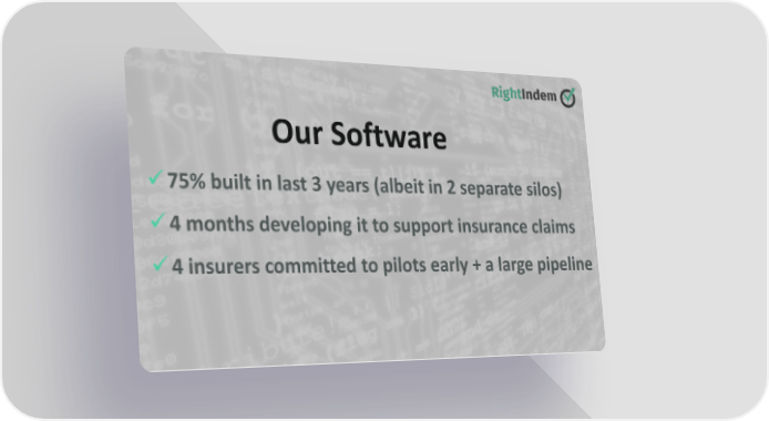 InsurTech | RightIndem SLIDES Page 8 Page 10Our Software 75% built in last 3 years (albeit in 2 separate silos) 4 months developing it to support insurance claims 4 insurers committed to pilots early + a large pipeline