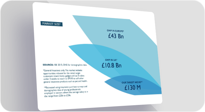 MARKET SIZE* GWP IN EUROPE* £43 Bn GWP IN UK* SOURCE: ABI 2015, ONS for demographics data. £10.8 Bn *General Insurance only. The market includes opportunities relevant for the initial target customers: travel, home, gadget and car. It takes under 3 weeks to teach to SPIXII to sell other general insurance products such as pet and health. OUR TARGET NICHE** **Estimated using insurance purchase surveys and demographics data of young professionals £130 M employed in sectors where the average salary is in the range from £25k to £35k.