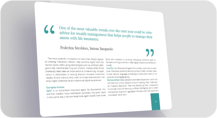 One of the most valuable trends over the next year could be robo- “ advice for wealth management that helps people to manage their “assets with life insurance. Federica Strobino, Intesa Sanpaolo The most powerful innovators do more than simply digitise Spixii also connects to existing messaging platforms with its an existing interaction. Rather, they combine digital with the founders aiming to deliver a fully digital insurance distribution human touch, often using technologies such as artificial intelli- model. gence (AI), machine learning and robotics. Indeed, while AI has Insurify is an AI-powered agent that enables customers to start previously been seen as most useful to underwriting, its appli- a car insurance quote by texting a photo of their number plate. cation in distribution is helping insurers increase conversion It uses natural language processing to respond to users in an results. AI and robotics help insert a human characteristic into accurate and engaging way. what might otherwise be an impersonal digital experience. MyFutureNow helps people consolidate old pension plans into one low-cost online pension account helping them make bet- Examples include: ter financial decisions. They are developing their proposition Spixii is an automated insurance agent. Its AI-powered, mo- to include machine learning, artificial intelligence and a smart bile-first chatbot helps individuals purchase insurance much comparison engine to aggregate the data and find customers in the same way a human telephone agent would have done. one better value plan. 13