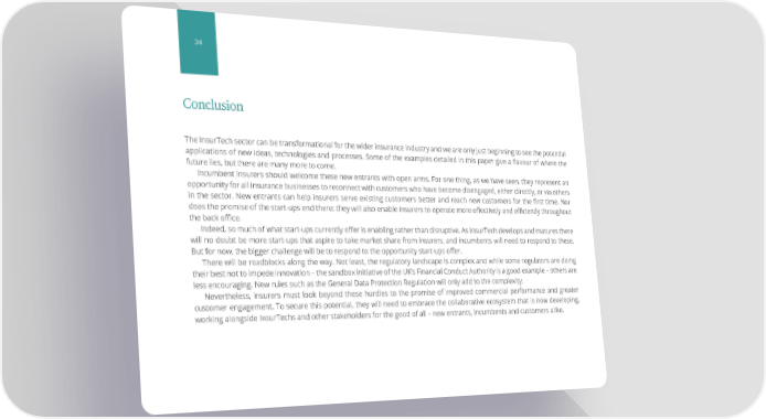34 Conclusion The InsurTech sector can be transformational for the wider insurance industry and we are only just beginning to see the potential applications of new ideas, technologies and processes. Some of the examples detailed in this paper give a flavour of where the future lies, but there are many more to come. Incumbent insurers should welcome these new entrants with open arms. For one thing, as we have seen, they represent an opportunity for all insurance businesses to reconnect with customers who have become disengaged, either directly, or via others in the sector. New entrants can help insurers serve existing customers better and reach new customers for the first time. Nor does the promise of the start-ups end there: they will also enable insurers to operate more effectively and efficiently throughout the back office. Indeed, so much of what start-ups currently offer is enabling rather than disruptive. As InsurTech develops and matures there will no doubt be more start-ups that aspire to take market share from insurers, and incumbents will need to respond to these. But for now, the bigger challenge will be to respond to the opportunity start-ups offer. There will be roadblocks along the way. Not least, the regulatory landscape is complex and while some regulators are doing their best not to impede innovation – the sandbox initiative of the UK’s Financial Conduct Authority is a good example – others are less encouraging. New rules such as the General Data Protection Regulation will only add to the complexity. Nevertheless, insurers must look beyond these hurdles to the promise of improved commercial performance and greater customer engagement. To secure this potential, they will need to embrace the collaborative ecosystem that is now developing, working alongside InsurTechs and other stakeholders for the good of all – new entrants, incumbents and customers alike.