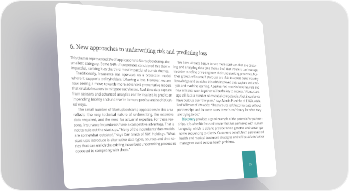 6. New approaches to underwriting risk and predicting loss This theme represented 3% of applications to Startupbootcamp, the We have already begun to see more start-ups that are captur- smallest category. Some 54% of corporates considered this theme ing and analysing data (see theme five) that insurers can leverage impactful, ranking it as the third most impactful of our six themes. in order to refine or re-engineer their underwriting processes. Fur- Traditionally, insurance has operated on a protection model ther growth will come if start-ups are able to access deep industry where it supports policyholders following a loss. However, we are knowledge and combine this with improved data capture and anal- now seeing a move towards more advanced, preventative models ysis and machine learning. A partner-led model where insurers and that enable insurers to mitigate such losses. Real-time data capture new entrants work together will be the key to success. “Alone, start- from sensors and advanced analytics enable insurers to predict an ups still lack a number of essential competencies that incumbents impending liability and underwrite in more precise and sophisticat- have built up over the years,” says Martin Pluschke of ERGO, while ed ways. Rod Willmott of LV= adds: “The start-ups lack historical data without The small number of Startupbootcamp applications in this area partnerships and in some cases there is no history for what they reflects the very technical nature of underwriting, the extensive are trying to do.” data required, and the need for actuarial expertise. For these rea- Discovery provides a good example of the potential for partner- sons, insurance incumbents have a competitive advantage. That is ships. It is a health-focused insurer that has partnered with Human not to rule out the start-ups. “Many of the incumbents’ data models Longevity, which is able to provide whole genome and cancer ge- are somewhat outdated,” says Dan Smith of MMI Holdings. “What nome sequencing to clients. Customers benefit from personalised start-ups introduce is alternative data types, sources and time se- health and medical treatment strategies and will be able to better ries that can enrich the existing incumbent underwriting process as manage or avoid serious health problems. opposed to competing with them.” 25