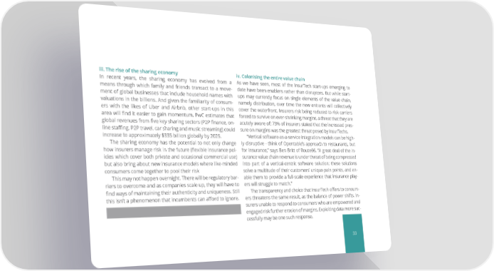 iii. The rise of the sharing economy iv. Colonising the entire value chain In recent years, the sharing economy has evolved from a As we have seen, most of the InsurTech start-ups emerging to means through which family and friends transact to a move- date have been enablers rather than disruptors. But while start- ment of global businesses that include household names with ups may currently focus on single elements of the value chain, valuations in the billions. And given the familiarity of consum- namely distribution, over time the new entrants will collectively ers with the likes of Uber and Airbnb, other start-ups in this cover the waterfront. Insurers risk being reduced to risk carriers area will find it easier to gain momentum. PwC estimates that forced to survive on ever-shrinking margins, a threat that they are global revenues from five key sharing sectors (P2P finance, on- acutely aware of: 73% of insurers stated that the increased pres- line staffing, P2P travel, car sharing and music streaming) could sure on margins was the greatest threat posed by InsurTechs. increase to approximately $335 billion globally by 2025. “Vertical software-as-a-service integration models can be high- The sharing economy has the potential to not only change ly disruptive - think of Opentable’s approach to restaurants, but how insurers manage risk in the future (flexible insurance pol- for insurance,” says Ben Britt of Route66. “A great deal of the in- icies which cover both private and occasional commercial use) surance value chain revenue is under threat of being compressed but also bring about new insurance models where like-minded into part of a vertical-centric software solution; these solutions consumers come together to pool their risk solve a multitude of their customers’ unique pain points, and en- This may not happen overnight. There will be regulatory bar- able them to provide a full-scale experience that insurance play- riers to overcome and as companies scale up, they will have to ers will struggle to match.” find ways of maintaining their authenticity and uniqueness. Still The transparency and choice that InsurTech offers to consum- this isn’t a phenomenon that incumbents can afford to ignore. ers threatens the same result, as the balance of power shifts. In- surers unable to respond to consumers who are empowered and engaged risk further erosion of margins. Exploiting data more suc- cessfully may be one such response. 33