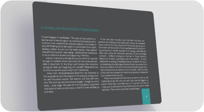 A closing note from Sabine VanderLinden “It won’t happen in my lifetime.” This was still the common re- In the few short months since that first InsurTech pro- sponse only 18 months ago to my conviction that startup-led in- gramme the landscape has continued to evolve at breakneck novation could transform the insurance industry. I remember in speed. And much of the scepticism of 18 months ago has gone. early 2015 talking about the subject to practitioners from Lloyd’s, Now there are thousands of start-ups dedicated to transform- leading London insurers and the wider market. They seemed ing an insurance market that yearns for change. And while we overwhelmed by what I was saying – that InsurTech could prove often hear about the innovative potential of the technology to be as influential as what was happening in FinTech. involved – Artificial Intelligence, Internet of Thing, Robotics, Indeed, it seemed as though the success of FinTech was not Blockchain, Drones, Augmented and Virtual Reality – it’s their enough to convince these executives that the same was pos- dedication to solving compelling insurance problems in uncon- sible in InsurTech. Or that they could harness this innovative ventional ways that distinguish many of these businesses from energy for their own huge long-term benefit. “What will it take what went before. The best of them are asking why large corpo- for them to see the opportunity I see?” I wondered. rate processes are so complex and convoluted – and this drive Since then, Startupbootcamp InsurTech has delivered its to find pertinent answers to impertinent questions is what will first programme with the support of 14 amazing leading insur- truly transform the industry. ers and insurance experts, 100 mentors and over 200 inves- Those incumbents that take the time now to listen to this tors. The start-ups we selected were largely – though not exclu- impertinence are the ones who will likely reap the biggest re- sively – early stage. This was the first truly global programme wards. Those who close their ears to it may well lose out. So dedicated to them, so there was a need for some catching up, I urge you to embrace the InsurTech evolution sooner rather as it were. than later. The transformation has already begun. 35