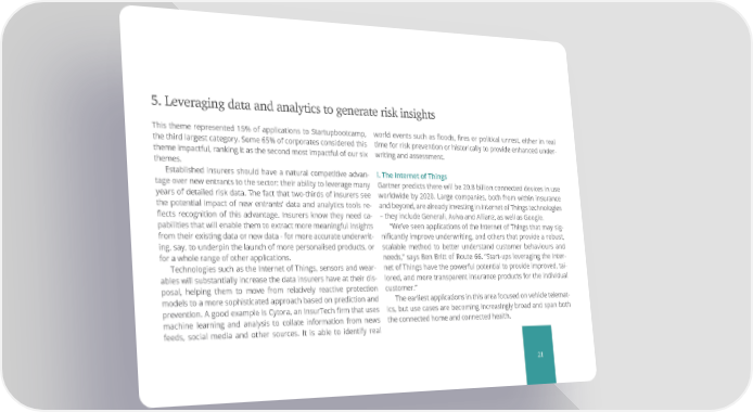 5. Leveraging data and analytics to generate risk insights This theme represented 15% of applications to Startupbootcamp, world events such as floods, fires or political unrest, either in real the third largest category. Some 65% of corporates considered this time for risk prevention or historically to provide enhanced under- theme impactful, ranking it as the second most impactful of our six writing and assessment. themes. Established insurers should have a natural competitive advan- i. The Internet of Things tage over new entrants to the sector: their ability to leverage many Gartner predicts there will be 20.8 billion connected devices in use years of detailed risk data. The fact that two-thirds of insurers see worldwide by 2020. Large companies, both from within insurance the potential impact of new entrants’ data and analytics tools re- and beyond, are already investing in Internet of Things technologies flects recognition of this advantage. Insurers know they need ca- – they include Generali, Aviva and Allianz, as well as Google. pabilities that will enable them to extract more meaningful insights “We’ve seen applications of the Internet of Things that may sig- from their existing data or new data - for more accurate underwrit- nificantly improve underwriting, and others that provide a robust, ing, say, to underpin the launch of more personalised products, or scalable method to better understand customer behaviours and for a whole range of other applications. needs,” says Ben Britt of Route 66. “Start-ups leveraging the Inter- Technologies such as the Internet of Things, sensors and wear- net of Things have the powerful potential to provide improved, tai- ables will substantially increase the data insurers have at their dis- lored, and more transparent insurance products for the individual posal, helping them to move from relatively reactive protection customer.” models to a more sophisticated approach based on prediction and The earliest applications in this area focused on vehicle telemat- prevention. A good example is Cytora, an InsurTech firm that uses ics, but use cases are becoming increasingly broad and span both machine learning and analysis to collate information from news the connected home and connected health. feeds, social media and other sources. It is able to identify real 21