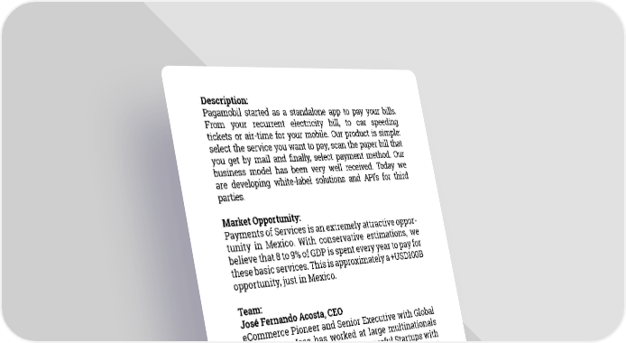 Description: Pagamobil started as a standalone app to pay your bills. From your recurrent electricity bill, to car speeding tickets or air-time for your mobile. Our product is simple: select the service you want to pay, scan the paper bill that you get by mail and finally, select payment method. Our business model has been very well received. Today we are developing white-label solutions and API’s for third parties. Market Opportunity: Payments of Services is an extremely attractive oppor- tunity in Mexico. With conservative estimations, we believe that 8 to 9% of GDP is spent every year to pay for these basic services. This is approximately a +USD100B opportunity, just in Mexico. Team: José Fernando Acosta, CEO eCommerce Pioneer and Senior Executive with Global Experience. Jose has worked at large multinationals such as Walmart as well as in successful Startups with Exits. Jose is passionate about launching ventures & making businesses grow. Juan Carlos García, Co-Founder Digital Transformation leader focused on how techno- logy will shape the future of business. Co-Founder of Several startups that led to successful M&A deals. First CEO for Amazon Mexico and currently leading the glo- bal digital strategy of one of the top retailers in Mexico. #sbcDemoDay TABLE OF CONTENTS