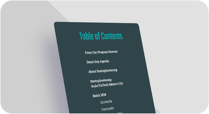 Table of Contents From Our Program Director Demo Day Agenda About Startupbootcamp Startupbootcamp Scale FinTech Mexico City Batch 2018 Quotanda Facturedo Expediente Azul Pagamobil Our Team Our Partners #sbcDemoDay