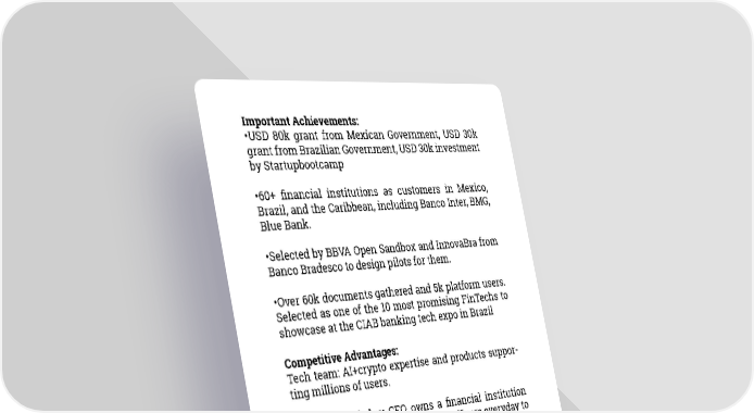 Important Achievements: •USD 80k grant from Mexican Government, USD 30k grant from Brazilian Government, USD 30k investment by Startupbootcamp •60+ financial institutions as customers in Mexico, Brazil, and the Caribbean, including Banco Inter, BMG, Blue Bank. •Selected by BBVA Open Sandbox and InnovaBra from Banco Bradesco to design pilots for them. •Over 60k documents gathered and 5k platform users. Selected as one of the 10 most promising FinTechs to showcase at the CIAB banking tech expo in Brazil Competitive Advantages: Tech team: AI+crypto expertise and products suppor- ting millions of users. Market knowledge: CEO owns a financial institution with access to customers and loan officers everyday to test, learn and innovate. International operations. Ex- perienced entrepreneurs with exits. Fundraising USD 1,000,000 Potential Customers Financial: Banks, credit unions, brokers. Other sectors gathering many documents: HR, Legal, Property, Ren- tal, Claims, etc. #sbcDemoDay TABLE OF CONTENTS
