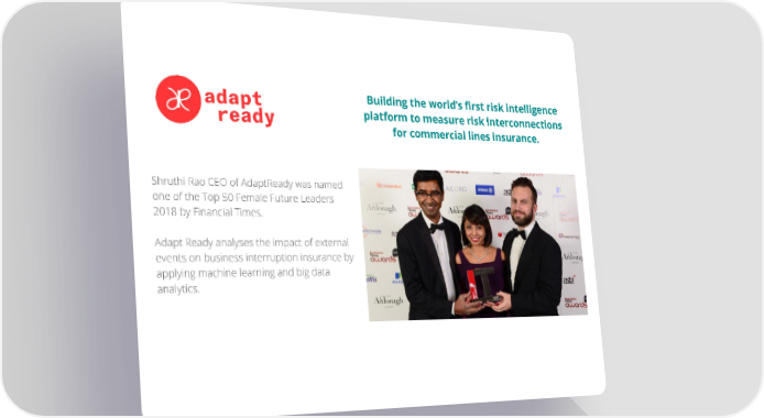 Building the world’s first risk intelligence platform to measure risk interconnections for commercial lines insurance. Shruthi Rao CEO of AdaptReady was named one of the Top 50 Female Future Leaders 2018 by Financial Times. Adapt Ready analyses the impact of external events on business interruption insurance by applying machine learning and big data analytics.