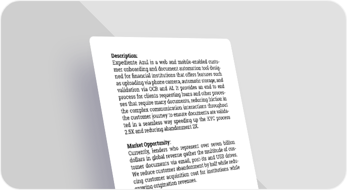 Description: Expediente Azul is a web and mobile-enabled custo- mer onboarding and document automation tool desig- ned for financial institutions that offers features such as uploading via phone camera, automatic storage, and validation via OCR and AI. It provides an end to end process for clients requesting loans and other proces- ses that require many documents, reducing friction in the complex communication interactions throughout the customer journey to ensure documents are valida- ted in a seamless way speeding up the KYC process 2.5X and reducing abandonment 2X. Market Opportunity: Currently, lenders who represent over seven billion dollars in global revenue gather the multitude of cus- tomer documents via email, post-its and USB drives. We reduce customer abandonment by half while redu- cing customer acquisition cost for institutions while growing origination revenues. Team: Juan Carlos González, CEO Owns financial institution focusing in large loans fun- ded by the Mexican Stock Market, hundreds of loans to date. Nominated Young Business Man of the Year. Two exits with the CTO. Roberto Ibarra, CTO Created apps with millions of users, two of them nomi- nated for the best in the World, Young Global Leader of the World Economic Forum. 2 company exits. “One of Mexico’s promises” - CNN. “30 Promesas 2017”. #sbcDemoDay TABLE OF CONTENTS