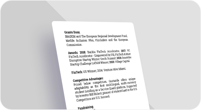 Grants from: INADEM and The European Regional Development Fund, Metlife Inclusion Plus, Fincluders and the European Commission. Awards: 2018: Bankia FinTech Accelerator; 2017: VC FinTech Accelerator - Empowered by FIS, FinTech & Most Disruptive Startup Winner South Summit; 2016: Innotribe Startup Challenge LATAM Winner; 2015: Village Capital FinTech: US Winner; 2014: Venture Hive Miami. Competitive Advantages: Priced below competition, Quotanda offers unique adaptability as the first multilingual, multi-currency student Lending as a Service (LaaS) platform. Supported by investor Bill Hubert, pioneer of student LaaS in the U.S. Competitors are U.S. focused. Fundraising $500,000 USD Potential Customers Universities, professional training courses (ie. code boot- camps), regional governments interested in offering student loans, foundations and banks. #sbcDemoDay TABLE OF CONTENTS