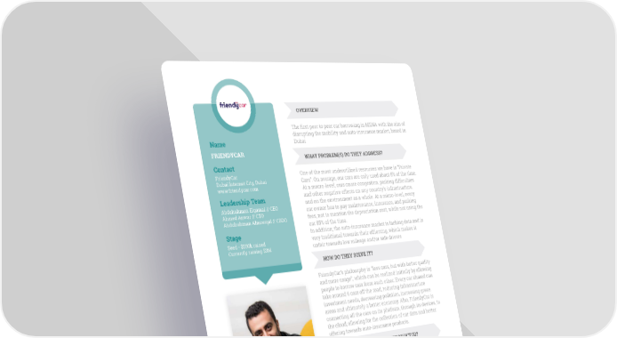 03 OVERVIEW The first peer to peer car borrowing in MENA with the aim of disrupting the mobility and auto-insurance market, based in Name Dubai FRIENDYCAR WHAT PROBLEM(S) DO THEY ADDRESS? Contact FriendyCar One of the most underutilized resources we have is “Private Dubai Internet City, Dubai Cars”. On average, our cars are only used about 5% of the time. www.friendycar.com At a macro-level, cars cause congestion, parking difficulties Leadership Team and other negative effects on any country’s infrastructure, Abdelrahman Elgamal // CEO and on the environment as a whole. At a micro-level, every Ahmed Anwar // CTO car owner has to pay maintenance, insurance, and parking Abdulrahman Almoeiqal // CBDO fees, not to mention the depreciation cost, while not using the car 95% of the time. Stage In addition; the auto-insurance market is lacking data and is Seed - $550k raised very traditional towards their offierring, which makes it Currently raising $3M unfair towards low mileage and/or safe drivers HOW DO THEY SOLVE IT? FriendyCar’s philosophy is “less cars, but with better quality and more usage”, which can be realized initially by allowing people to borrow cars from each other. Every car shared can take around 6 cars off the road, reducing infrastructure investment needs, decreasing pollution, increasing green areas and ultimately a better economy. Also, FriendyCar is connecting all the cars on its platform, through its devices, to the cloud; allowing for the collection of car data and better offering towards auto-insurance products. WHAT IS THEIR SOLUTION PRODUCT(S)? A car borrowing platform for car owners to let others borrow their car, complemented by an analytics and tracking dongle which provides telematic data about every vehicle used/ borrowed on the Friendycar network. WHAT IS THEIR COMPETITIVE EDGE? First to market, innovative approach allowing minimum capital investment, faster scalability and focus on technology, product depth beyond the tradition car rental model, big data The program introduced me analytics and repeat customer to great mentors who ROADMAP provided me with helpful insights on how to grow my The 2018 roadmap is to gain approval and official licence business from RTA before launching in Dubai fully. Also Launching Friendy-Insurance “Low mileage insurance” product. SBC Program Report | 24