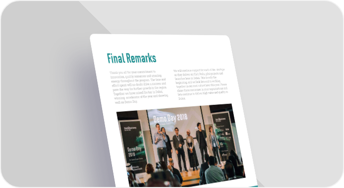 Final Remarks Thank you all for your commitment to We will continue support for each of the startups innovation, quality resources and amazing as they deliver on their PoCs, pilot projects and energy throughout the program. The time and launches here in Dubai. This is only the effort spent will no doubt drive a success and beginning, and we look forward to working pave the way for further growth in the region. together in our next cohort later this year. Please Together we have raised the bar in Dubai, share these successes in your organizations and winning accelerator of the year and showing lets continue to deliver high value and quality in well on Demo Day. Dubai. Program Partner Global Partner SBC Program Report | 18