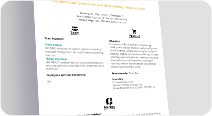EuropeOne Specialist for smartphone-driven cross-border banking throughout Europe Country: UK | City: London | Employees: 5 Year Started: August 2014 | Sector: Retail Banking Product stage: Idea | Website: europeone.com Team Product Team Founders: What is it? Europeone will focus its efforts on technology Anton Sergeev development that will enable or vastly simplify cross- LBS MBA, more than 15 years in investment banking border banking. Europeone’s novelty lies partly in its and asset management. Successfully launched several simplicity enabled by innovative mobile app features, ventures. removing unnecessary barriers to create an account Philipp Buschman and handle financial transactions, multilingual LBS MBA, IT development and consulting background, interface, free/low-fee remittances and accessible serial entrepreneur, took one of his companies public anywhere (and anytime) online. in the USA Revenue model: Direct Sales Employees, Advisors & Investors: Scalability: N/A Previous funding: N/A Average monthly revenues: N/A Planned fundraising: 1,000,000-1,700,000 EUR Market What is the need or problem being satisfied? It is very difficult for people moving from one country to the next to get access to a local bank account allowing multiple currencies. In addition, money transfers are expensive and take time. Europeone is a pan-european bank addressing these problems. Competitive Advantage: Our business model minimises charges for account usage while focusing on the range of services offered, eliminating transfer fees wherever possible, improving fx rates and tailoring asset management products. We aim to grow aggressively and remain purely an online/mobile bank, innovatively engaging a range of alternative transaction channels. our costs to acquire customers will be significantly cheaper than competitors. Market Size: 20m Europeans working abroad within Europe and change countries and accounts regularly. 70m have regular cross-border banking needs. These numbers grow by around 10% p.a. Our main competitors are traditional remittance providers (i.e. Western Union) and retail banks (Unicredit, CA, etc). Challenger banks (i.e. Monese).
