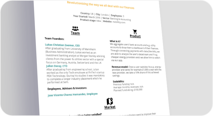 moBILLity Revolutionizing the way we all deal with our finances Country: UK | City: London | Employees: 3 Year Started: March 2016 | Sector: Banking & Accounting Product stage: Idea | Website: mobillity.com Team Product Team Founders: What is it? We aggregate users’ bank accounts and e.g. utility Lukas Christian Zoerner, CEO accounts & show them a dashboard of their finances. After graduating from University of Mannheim Through connecting payments with data (like bills), we (Business Administration). Lukas worked as an are able to analyze the user’s datastream and if e.g. investment banking analyst at Morgan Stanley advising cheaper energy providers exist we allow him to switch clients from the power & utilities sector with a special via our app. focus on Germany, Austria, Switzerland and the UK Julien Deray, CTO Revenue model: Once a user switches his e.g. energy- After graduating from engineering school, Julian provider and saves for example £1,000 a year with the worked as the only Tech employee at FinTech startup new provider, we take a 10% share of this achieved PDX Technology. During his studies it was mandatory savings. to complete a longer industry placement which he performed at Serli. Scalability: Previous funding: N/A Employees, Advisors & Investors: Average monthly revenues: N/A Planned fundraising: £150,000 Jose Vicente Chavez Hernandez, Employee Market What is the need or problem being satisfied? Consumers don’t have time & know-how to handle their finances but nevertheless want to improve their financial situation. Competitive Advantage: Through combining personal finance management, price comparison websites, bill management and in the future also bill payment (through PSD2), we offer our users a one-stop solution which deals with all their finances in one place. This platform concept allows us in the future to scale through on-top products like e.g. automatic investments of saved money. Competitors show users how bad their finances are but we are the ones improving them. Market Size: We waste ~£800/pa by having overpriced/oversized recurring contracts for energy, mobile, etc. Hence c. £20bn could be saved every year if all households switched to better contracts. Aggregators don’t see that showing users how bad their finances are is not enough, and switching platforms don’t see that users need a one-stop solution for finances.
