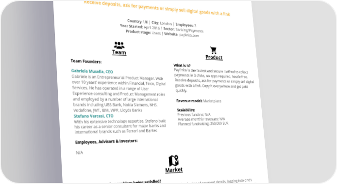 Paylinko Receive deposits, ask for payments or simply sell digital goods with a link Country: UK | City: London | Employees: 3 Year Started: April 2016 | Sector: Banking/Payments Product stage: Users | Website: paylinko.com Team Product Team Founders: What is it? Paylinko is the fastest and secure method to collect Gabriele Musella, CEO payments in 3 clicks, no apps required, hassle free. Gabriele is an Entrepreneurial Product Manager. With Receive deposits, ask for payments or simply sell digital over 10 years’ experience within Financial, Telco, Digital goods with a link. Copy it everywhere and get paid Services. He has operated in a range of User quickly. Experience consulting and Product Management roles and employed by a number of large international Revenue model: Marketplace brands including UBS Bank, Nokia Siemens, NHS, Vodafone, JWT, IBM, WPP, Lloyds Banks Scalability: Previous funding: N/A Stefano Vercesi, CTO Average monthly revenues: N/A With his extensive technology expertise. Stefano built Planned fundraising: 250,000 EUR his career as a senior consultant for major banks and international brands such as Ferrari and Bantec Employees, Advisors & Investors: N/A Market What is the need or problem being satisfied? Paying people for smaller is a tedious process, it requires risky sharing of payment details, logging into one’s bank account mostly necessitating a connected computer and sending across money. Paylinko gets rid of all this hassle by providing a single link containing all details that can be easily shared across platform and devices. Competitive Advantage: We can offer lower fees (1.9%+20p). We can operate in GBP and EURO (no one of the competitors is in Europe). There is no need to have an account, or app installed, just use your credit card. We focus on the low-end market. We plan to implement a proprietary blockchain back-end technology and be the “first blockchain-base payments system for the low-end consumers. Market Size: Our typical customers are Contractors, Group Organisers and Professionals providing mobile services. Our market size is 600 million market worldwide and our main competitor is paypal.