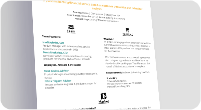 OctoBank A personal banking/financial service based on customer transaction and behaviour analysis Country: Russia | City: Moscow | Employees: 10+ Year Started: December 2014 | Sector: Banking & Accounting Product stage: Users | Website: octobank.com Team Product Team Founders: What is it? It’s a multi-banking app where people can connect their Irakli Agladze, CEO current bank accounts (according to PSD2 directive, or Product Manager with extensive client service other available APIs), and use it as a single-entry app experience and expertise in SMEs for their finances Denis Moskalets, CTO Developer with 9+ years experience in creating After the bank accounts are connected, a person can products for financial and consumer markets start using our app as he/she would use his or her standard mobile banking app. The difference is that Employees, Advisors & Investors: now all of his bank accounts are in one place. Slava Akulov, Advisor Revenue model: Audience (Advertising/ Lead led) Product Manager at a leading privately-held bank in Russia Scalability: Nikita Filippov, Advisor Previous funding: N/A Process software engineer & product manager for Average monthly revenues: 50,000 EUR decades Planned fundraising: N/A Market What is the need or problem being satisfied? Universal banks can’t really stay on the same page with their customers, We provide a multi-banking app that lets anyone in EU connect their bank/card account to the app. Competitive Advantage: Most of our competitors are still in the prototype stage, wilse we already have our product launched with one of the largest banks in Europe Market Size: The market is divided into two parts: 1.) Millenials - There are currently 180m of them in the EU 2.) SMEs - There are 23m of them in the EU