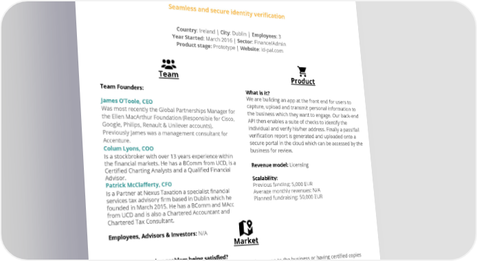 ID-pal Seamless and secure identity verification Country: Ireland | City: Dublin | Employees: 3 Year Started: March 2016 | Sector: Finance/Admin Product stage: Prototype | Website: id-pal.com Team Product Team Founders: What is it? We are building an app at the front end for users to James O’Toole, CEO capture, upload and transmit personal information to Was most recently the Global Partnerships Manager for the business which they want to engage. Our back-end the Ellen MacArthur Foundation (Responsible for Cisco, API then enables a suite of checks to identify the Google, Philips, Renault & Unilever accounts). individual and verify his/her address. Finally a pass/fail Previously James was a management consultant for verification report is generated and uploaded onto a Accenture. secure portal in the cloud which can be accessed by the Colum Lyons, COO business for review. Is a stockbroker with over 13 years experience within the financial markets. He has a BComm from UCD, is a Revenue model: Licensing Certified Charting Analysts and a Qualified Financial Advisor. Scalability: Patrick McClafferty, CFO Previous funding: 5,000 EUR Is a Partner at Nexus Taxation a specialist financial Average monthly revenues: N/A services tax advisory firm based in Dublin which he Planned fundraising: 50,000 EUR founded in March 2015. He has a BComm and MAcc from UCD and is also a Chartered Accountant and Chartered Tax Consultant. Employees, Advisors & Investors: N/A Market What is the need or problem being satisfied? Rather than a customer presenting identity documentation in person to the business or having certified copies endorsed by a notary and sent via the post, ID-Pal provides an app based solution for individuals and businesses to satisfy client due diligence requirements anytime, anywhere in less than 5 minutes. Competitive Advantage: Prevailing industry practice at present is an ad-hoc scanning, printing, certifying and inspecting procedure. RegTech competitors are focused on offering technology specific plug-in solutions for large cap clients to integrate into existing legacy systems. ID-Pal offers a broader suite of verification checks, packaged in a customisable off-the-shelf solution, specifically targeting small to mid-cap businesses via licensing / managed service model. Market Size: Anti-Money Laundering (AML) legislation comes from the EU and applies to all member states. The US would also abide by similar regulation. In the UK alone, over 18 million ID&V transactions last year at average cost of £30/€40 per applicant. Nascent but rapidly growing market.