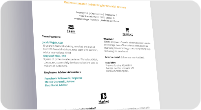Zenith One Online automated onboarding for financial advisors Country: UK | City: London | Employees: 5 Year Started: March 2016| Sector: AI Product stage: Prototype | Website: zenith.one Team Product Team Founders: What is it? ZENITH empowers financial advisors to acquire, advice Jacek Wojcik, CEO and manage mass affluent client’s assets as well as 10 years in financial advisory, recruited and trained improving the onboarding process, using cutting edge over 200 financial advisors, ran a team of 40 advisor's, technology on own brand! advice International HNWI Krzysztof Klein, CTO Revenue model: Software as a service (SaaS) 9 years of professional experience. Works for: AVEVA, LOTOS, BP. Successfully develop applications used by Scalability: Previous funding: 46,000 EUR millions of customers. Average monthly revenues: N/A Planned fundraising: N/A Employees, Advisors & Investors: Franciszek Kaliszweski, Employee Marcin Ostrowski, Advisor Piotr Bucki, Advisor Market What is the need or problem being satisfied? Currently large renowned financial advisor tend to have onerous and expensive onboarding processes with multiple forms to fill out. This leads to loss of interest from clients who go to their younger, client friendlier competitors. By allowing them to seamlessly and electronically onboard their clients, costs are reduced and new clients acquired. Competitive Advantage: We are aware that there are competitors such as Wealth Kernel, Wealth objects and other who are doing almost the same. However, none of them can implement the product in a few minutes for minimum price and understand how important simplicity and the customer journey is. Market Size: We have 94 financial advisory companies in the pipeline. We are connected to management boards or advisors working there. We have 10 companies with strong sales opportunity and 2 ambassadors who are connecting us to new customers. There are over 1000 companies in our database, created by our team, where we can implement our product.