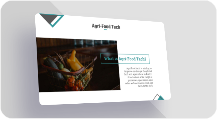 Agri-Food Tech What is Agri-Food Tech? Agri-food tech is aiming to improve or disrupt the global food and agriculture industry. it includes a wide range of processes, operations, and roles as food travels from the farm to the fork.