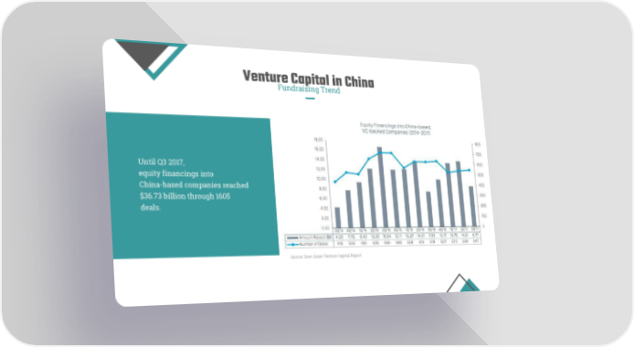 Venture Capital in China Fundraising Trend Until Q3 2017, equity financings into China-based companies reached $36.73 billion through 1605 deals. Source: Dow Jones Venture Capital Report