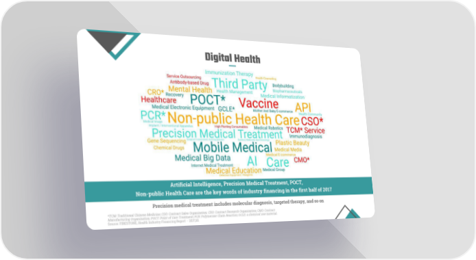 Digital Health Artificial Intelligence, Precision Medical Treatment, POCT, Non-public Health Care are the key words of industry financing in the first half of 2017 Precision medical treatment includes molecular diagnosis, targeted therapy, and so on *TCM: Traditional Chinese Medicine; CSO: Contract Sales Organization; CRO: Contract Research Organization; CMO: Contract Manufacturing Organization; POCT: Point of Care Treatment; PCR: Polymerase Chain Reaction; GCLE: a chemical raw material. Source: FIRESTONE, Health Industry Financing Report – 2017,H1