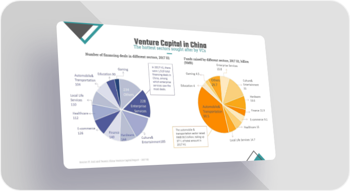 Venture Capital in China The hottest sectors sought after by VCs The hottest sectors sought after by VCs Number of financing deals in different sectors, 2017 H1 Funds raised by different sectors, 2017 H1, billion (RMB) Source: IT Juzi and Tecent, China Venture Capital Report – 2017 H1
