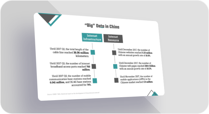 “Big” Data in China Internet Internet Infrastructure Resource Until December 2017, the number of Until 2017 Q2, the total length of the Chinese websites reached 5.33 million cable line reached 36.06 million with an annual growth rate of 10.6%. kilometers. Until December 2017, the number of Until 2017 Q3, the number of Internet Chinese web pages reached 260.4 billion broadband access ports reached 760 with an annual growth rate of 10.3%. million. Until 2017 Q3, the number of mobile Until November 2017, the number of communication base stations reached mobile applications (APPs) in the 6.041 million, and 3G/4G base stations Chinese market reached 3.9 million. accounted for 74%. Source: CNNIC “41th, Statistical report on the development of China Internet network”