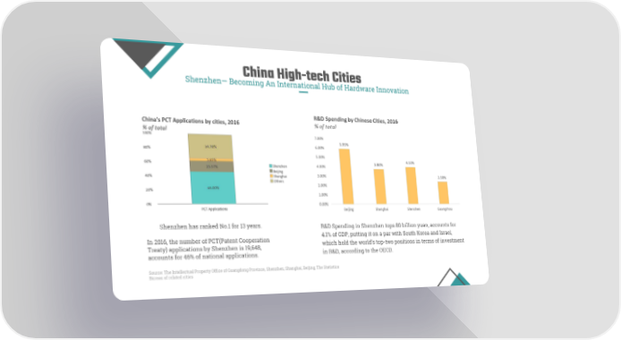 China High-tech Cities Shenzhen— Becoming An International Hub of Hardware Innovation Shenzhen has ranked No.1 for 13 years. R&D Spending in Shenzhen tops 80 billion yuan, accounts for 4.1% of GDP, putting it on a par with South Korea and Israel, In 2016, the number of PCT(Patent Cooperation which hold the world’s top-two positions in terms of investment Treaty) applications by Shenzhen is 19,648, in R&D, according to the OECD. accounts for 46% of national applications. Source: The Intellectual Property Office of Guangdong Province, Shenzhen, Shanghai, Beijing; The Statistics Bureau of related cities