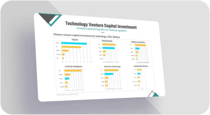 Technology Venture Capital Investment Investors placed big bets on Chinese upstarts Chinese venture-capital investment by technology, 2016, $billion Fintech Virtual Reality Robotics and drones Autonomous Driving Artificial Intelligence Education Technology Source: Mckinsey Global Institute