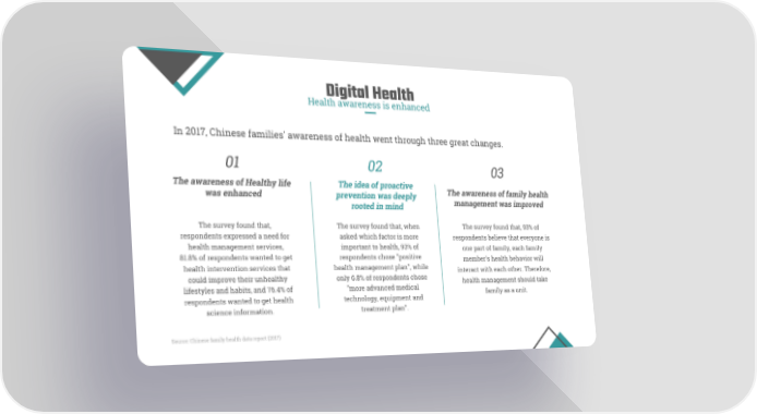 Digital Health Health awareness is enhanced In 2017, Chinese families' awareness of health went through three great changes. 01 02 03 The awareness of Healthy life The idea of proactive The awareness of family health was enhanced prevention was deeply management was improved rooted in mind The survey found that, The survey found that, when The survey found that, 93% of respondents expressed a need for asked which factor is more respondents believe that everyone is health management services, important to health, 93% of one part of family, each family 81.8% of respondents wanted to get respondents chose "positive member's health behavior will health intervention services that health management plan", while interact with each other. Therefore, could improve their unhealthy only 6.8% of respondents chose health management should take lifestyles and habits, and 76.4% of "more advanced medical family as a unit. respondents wanted to get health technology, equipment and science information. treatment plan". Source: Chinese family health data report (2017)