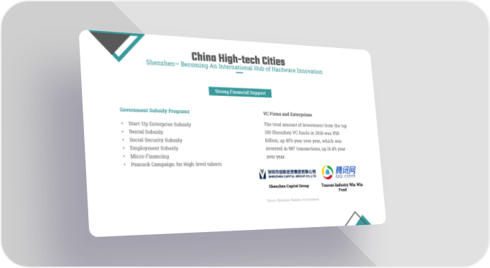 China High-tech Cities Shenzhen— Becoming An International Hub of Hardware Innovation Strong Financial Support Government Subsidy Programs VC Firms and Enterprises The total amount of investment from the top • Start-Up Enterprise Subsidy 100 Shenzhen VC funds in 2016 was ¥58 • Rental Subsidy billion, up 40% year over year, which was • Social Security Subsidy invested in 987 transactions, up 16.4% year • Employment Subsidy • Micro-Financing over year. • Peacock Campaign: for High-level talents Shenzhen Capital Group Tencent Industry Win-Win Fund Source: Shenzhen Chamber of Investment