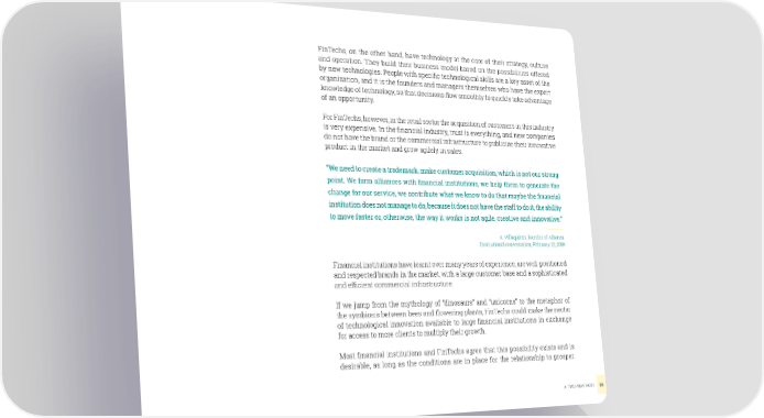 FinTechs, on the other hand, have technology at the core of their strategy, culture and operation. They build their business model based on the possibilities offered by new technologies. People with speciic technological skills are a key asset of the organization, and it is the founders and managers themselves who have the expert knowledge of technology, so that decisions low smoothly to quickly take advantage of an opportunity. For FinTechs, however, in the retail sector the acquisition of customers in this industry is very expensive. In the inancial industry, trust is everything, and new companies do not have the brand or the commercial infrastructure to publicize their innovative product in the market and grow agilely in sales. “We need to create a trademark, make customer acquisition, which is not our strong point. We form alliances with inancial institutions, we help them to generate the change for our service, we contribute what we know to do that maybe the inancial institution does not manage to do, because it does not have the staff to do it, the ability to move faster or, otherwise, the way it works is not agile, creative and innovative.” A. Villaquirán, founder of Alkanza Institutional conversation, February 12, 2018 Financial institutions have learnt over many years of experience, are well-positioned and respected brands in the market, with a large customer base and a sophisticated and eficient commercial infrastructure. If we jump from the mythology of “dinosaurs” and “unicorns” to the metaphor of the symbiosis between bees and lowering plants, FinTechs could make the nectar of technological innovation available to large inancial institutions in exchange for access to more clients to multiply their growth. Most inancial institutions and FinTechs agree that this possibility exists and is desirable, as long as the conditions are in place for the relationship to prosper. A TWO-WAY PATH38