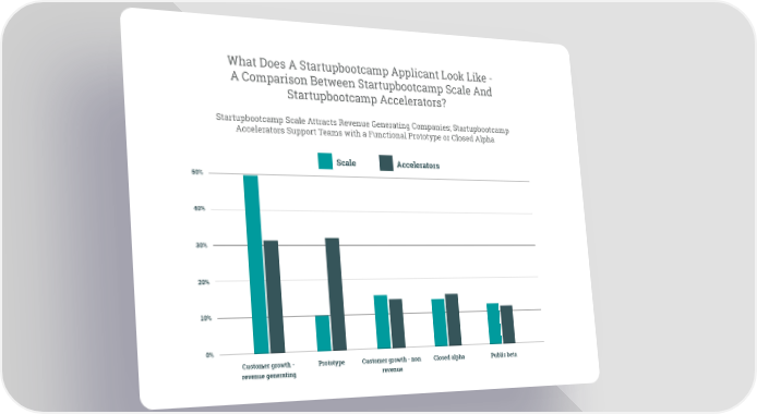 What Does A Startupbootcamp Applicant Look Like - A Comparison Between Startupbootcamp Scale And Startupbootcamp Accelerators? Startupbootcamp Scale Attracts Revenue Generating Companies; Startupbootcamp Accelerators Support Teams with a Functional Prototype or Closed Alpha Scale Accelerators 50% 40% 30% 20% 10% 0% Customer growth - Prototype Customer growth - non Closed alpha Public beta revenue generating revenue