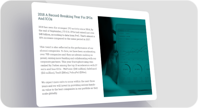 2018 A Record-Breaking Year For IPOs And ICOs 2018 has seen the strongest IPO activity since 2014; By the end of September, 173 U.S. IPOs had raised just over $45 billion, according to data from PwC. That’s almost a 50% increase compared to the same period in 2017. This trend is also reflected in the performance of our alumni companies. To date, we have been accelerating over 700 companies and they are always making us proud, raising more funding and collaborating with our corporate partners. This year Startupbootcamp was ranked by Forbes among the top 10 accelerators with 27 exits and four ICOs - WePower ($40 million), SafeGuard ($12 million), TenX ($80m), PolicyPal ($20m). We expect more exits to occur within the next three years and we will invest in providing serious hands- on value to the best companies in our portfolio as they scale globally.