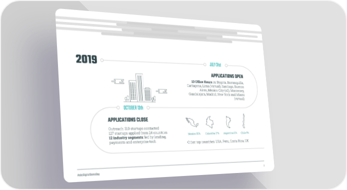 2019 JULY 31st APPLICATIONS OPEN 13 Office Hours in: Bogota, Barranquilla, Cartagena, Lima (virtual), Santiago, Buenos Aires, Mexico City (x2), Monterrey, Guadalajara, Madrid, New York and Miami (virtual). OCTOBER 13th APPLICATIONS CLOSE Outreach: 310 startups contacted 127 startups applied from 24 countries ombia 17% l gentina 11% 12 industry segments: led by lending, Mexico 32% Co Ar Chile 9% payments and enterprise tech Other top countries: USA, Peru, Costa Rica, UK #sbcDigitalDemoDay 7