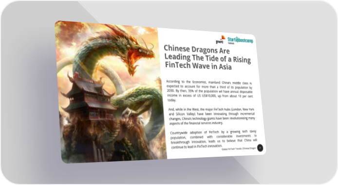 31 Chinese Dragons Are Leading The Tide of a Rising FinTech Wave in Asia According to the Economist, mainland China’s middle class is expected to account for more than a third of its population by 2030. By then, 35% of the population wil have annual disposable income in excess of US US$10,000, up from about 10 per cent today. And, while in the West, the major FinTech hubs (London, New York and Silicon Valley) have been innovating through incremental CH changes, China’s technology giants have been revolutionising many TE aspects of the financial services industry. N I F F O Countrywide adoption of FinTech by a growing tech savvy TE population, combined with considerable investments in TA S breakthrough innovation, leads us to believe that China will E continue to lead in FinTech innovation. TH Global FinTech Trends: Chinese Dragon 31