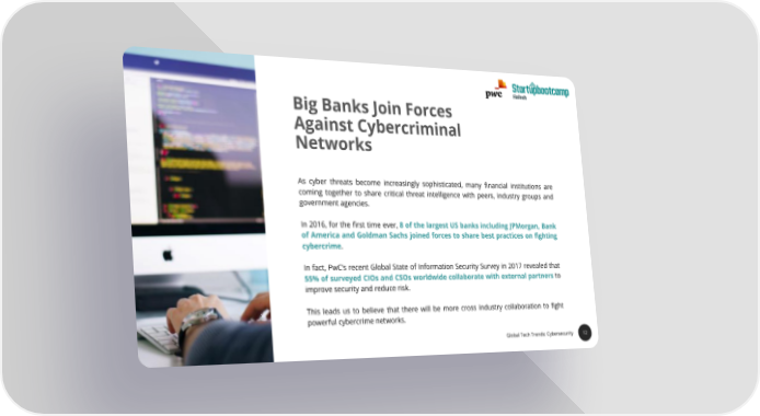 Big Banks Join Forces Against Cybercriminal Networks As cyber threats become increasingly sophisticated, many financial institutions are coming together to share critical threat intelligence with peers, industry groups and governmentagencies. In 2016, for the first time ever, 8 of the largest US banks including JPMorgan, Bank of America and Goldman Sachs joined forces to share best practices on fighting cybercrime. CH In fact, PwC’s recent Global State of Information Security Survey in 2017 revealed that TE 55%ofsurveyedCIOsandCSOsworldwidecollaboratewithexternalpartners to N I F improvesecurityandreducerisk. F O TE This leads us to believe that there will be more cross industry collaboration to fight TA S powerful cybercrime networks. E TH Global Tech Trends: Cybersecurity 12