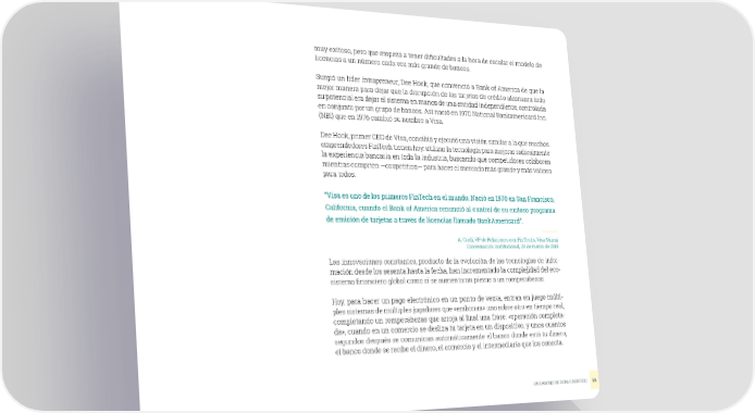muy exitoso, pero que empezó a tener dificultades a la hora de escalar el modelo de licencias a un número cada vez más grande de bancos. Surgió un líder intrapreneur, Dee Hock, que convenció a Bank of America de que la mejor manera para dejar que la disrupción de las tarjetas de crédito alcanzara todo su potencial era dejar el sistema en manos de una entidad independiente, controlada en conjunto por un grupo de bancos. Así nació en 1970 National Bankamericard Inc. (NBI) que en 1976 cambió su nombre a Visa. Dee Hock, primer CEO de Visa, concibió y ejecutó una visión similar a la que muchos emprendedores FinTech tienen hoy: utilizar la tecnología para mejorar radicalmente la experiencia bancaria en toda la industria, buscando que competidores colaboren mientras compiten —coopetition— para hacer el mercado más grande y más valioso para todos. “Visa es uno de los primeros FinTech en el mundo. Nació en 1970 en San Francisco, California, cuando el Bank of America renunció al control de su exitoso programa de emisión de tarjetas a través de licencias llamado BankAmericard”. A. Cueli, VP de Relaciones con FinTechs, Visa Miami Conversación institucional, 28 de marzo de 2018 Las innovaciones constantes, producto de la evolución de las tecnologías de infor- mación desde los sesenta hasta la fecha, han incrementado la complejidad del eco- sistema financiero global como si se aumentaran piezas a un rompecabezas. Hoy, para hacer un pago electrónico en un punto de venta, entran en juego múlti- ples sistemas de múltiples jugadores que «embonan» uno sobre otro en tiempo real, completando un rompecabezas que arroja al final una frase: «operación completa- da», cuando en un comercio se desliza tu tarjeta en un dispositivo, y unos cuantos segundos después se comunican automáticamente el banco donde está tu dinero, el banco donde se recibe el dinero, el comercio y el intermediario que los conecta. UN CAMINO DE DOBLE SENTIDO 58