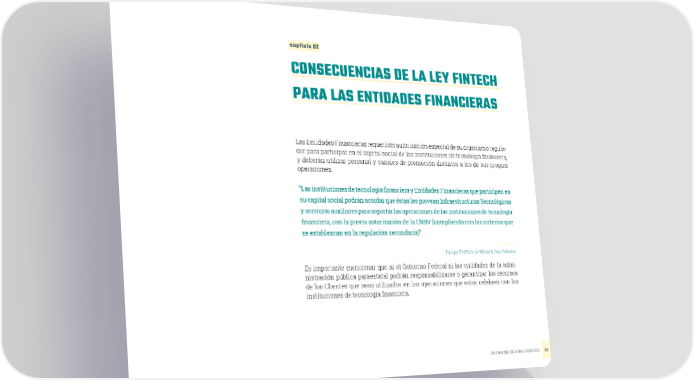 capítulo 02 CONSECUENCIAS DE LA LEY FINTECH PARA LAS ENTIDADES FINANCIERAS Las Entidades Financieras requerirán autorización especial de su organismo regula- dor para participar en el capital social de las instituciones de tecnología financiera, y deberán utilizar personal y canales de promoción distintos a los de sus propias operaciones. “Las instituciones de tecnología financiera y Entidades Financieras que participen en su capital social podrán acordar que éstas les provean Infraestructuras Tecnológicas y servicios auxiliares para soportar las operaciones de las instituciones de tecnología financiera, con la previa autorización de la CNBV (cumpliendo con los criterios que se establezcan en la regulación secundaria)”. Equipo FinTech de White & Case México Es importante mencionar que ni el Gobierno Federal ni las entidades de la admi- nistración pública paraestatal podrán responsabilizarse o garantizar los recursos de los Clientes que sean utilizados en las operaciones que estos celebren con las instituciones de tecnología financiera. UN CAMINO DE DOBLE SENTIDO 33