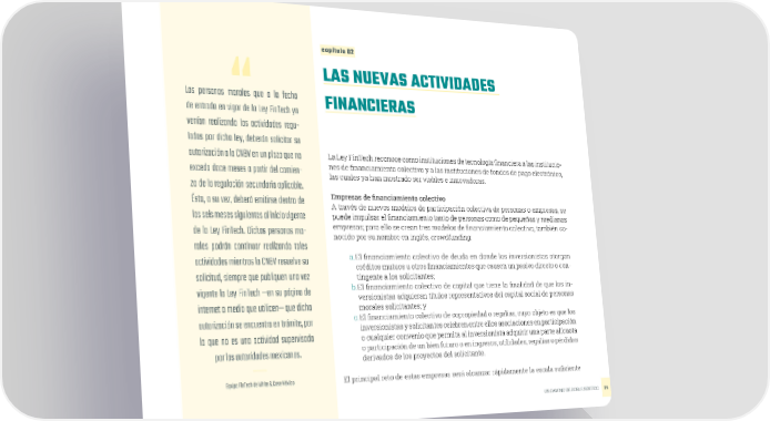 capítulo 02 LAS NUEVAS ACTIVIDADES Las personas morales que a la fecha FINANCIERAS de entrada en vigor de la Ley FinTech ya venían realizando las actividades regu- ladas por dicha ley, deberán solicitar su autorización a la CNBV en un plazo que no La Ley FinTech reconoce como instituciones de tecnología financiera a las institucio- exceda doce meses a partir del comien- nes de financiamiento colectivo y a las instituciones de fondos de pago electrónico, las cuales ya han mostrado ser viables e innovadoras. zo de la regulación secundaria aplicable. Ésta, a su vez, deberá emitirse dentro de Empresas de financiamiento colectivo A través de nuevos modelos de participación colectiva de personas o empresas, se los seis meses siguientes al inicio vigente puede impulsar el financiamiento tanto de personas como de pequeñas y medianas de la Ley FinTech. Dichas personas mo- empresas; para ello se crean tres modelos de financiamiento colectivo, también co- nocido por su nombre en inglés, crowdfunding: rales podrán continuar realizando tales El financiamiento colectivo de deuda en donde los inversionistas otorgan actividades mientras la CNBV resuelve su a. créditos mutuos u otros financiamientos que causen un pasivo directo o con- solicitud, siempre que publiquen una vez tingente a los solicitantes; b. vigente la Ley FinTech —en su página de El financiamiento colectivo de capital que tiene la finalidad de que los in- versionistas adquieran títulos representativos del capital social de personas internet o medio que utilicen— que dicha morales solicitantes; y autorización se encuentra en trámite, por c. El financiamiento colectivo de copropiedad o regalías, cuyo objeto es que los inversionistas y solicitantes celebren entre ellos asociaciones en participación lo que no es una actividad supervisada o cualquier convenio que permita al inversionista adquirir una parte alícuota por las autoridades mexicanas. o participación de un bien futuro o en ingresos, utilidades, regalías o pérdidas derivados de los proyectos del solicitante. Equipo FinTech de White & Case México El principal reto de estas empresas será alcanzar rápidamente la escala suficiente UN CAMINO DE DOBLE SENTIDO 29